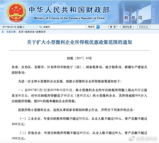 6日,財政部網(wǎng)站公布《關(guān)于擴大小型微利企業(yè)所得稅優(yōu)惠政策范圍的通知》,表示為進一步支持小型微利企業(yè)發(fā)展,調(diào)整所得稅政策。